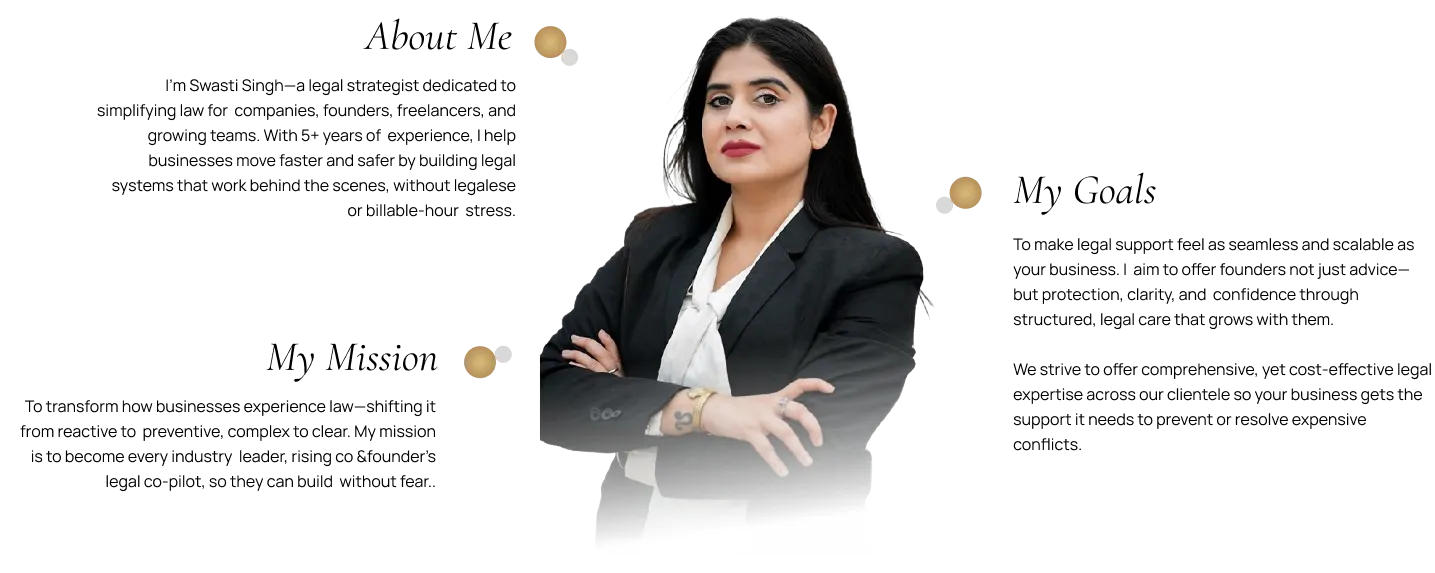 She specializes in contract structuring, compliance, employment frameworks, and founder-focused legal strategy—delivering clear, preventive solutions that grow with your business.From your first vendor contract to investor diligence, her work turns legal complexity into strategic clarity.Swasti ensures your legal foundation feels like a shield—not a burden.